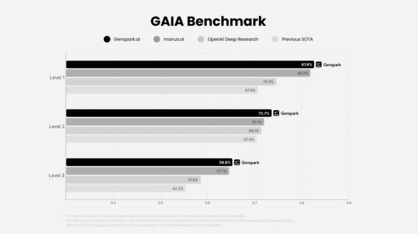 在GAIA基準測試中,Genspark在多個級別上也取得了優異的成績,表現甚至優于Manus和OpenAI Deep Research,更重要的是,Genspark還有中文版本。
