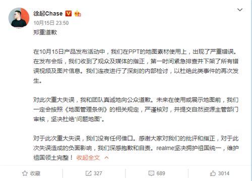10月15日晚,微博認(rèn)證為realme CMO(首席營(yíng)銷官)的賬號(hào)“徐起Chase”發(fā)布道歉信,稱在10月15日產(chǎn)品發(fā)布活動(dòng)中,realme 在PPT的地圖素材使用上出現(xiàn)了嚴(yán)重錯(cuò)誤。在發(fā)布會(huì)后,realme 收到了觀眾及媒體的指正,第一時(shí)間緊急排查并下架了所有錯(cuò)誤視頻及圖片信息。我們連夜進(jìn)行了深刻的內(nèi)部檢討,以杜絕此類事件的再次發(fā)生。