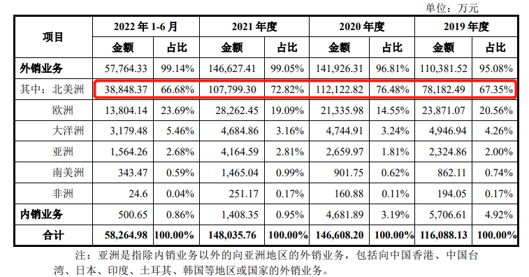 雖然申報(bào)稿里同時(shí)也指出,公司歷年來向前五大客戶銷售金額合計(jì)占營收的比例一直在50~60%左右,但進(jìn)一步整理后可以發(fā)現(xiàn),包括沃爾瑪在內(nèi),這些五大客戶多數(shù)位于北美地區(qū),該地區(qū)在公司主營業(yè)務(wù)收入中的占比一度超過70%。
