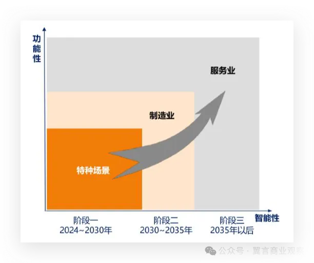 中國信通院在2024年底發(fā)布的《人形機器人產(chǎn)業(yè)發(fā)展報告》,區(qū)分了人形機器人商業(yè)化落地的三個階段,現(xiàn)在依然處于相當(dāng)早期的階段。
