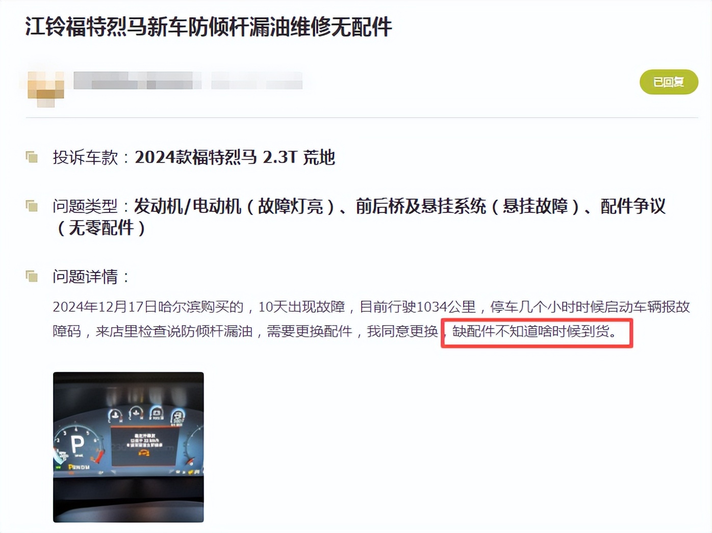 媒體調查發現,吳女士遭遇的配件短缺問題并非個例。在一些汽車投訴平臺及車主社區,均有江鈴福特車主反映車輛維修時面臨配件等待時間長、庫存不足的情況。