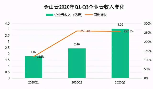 今年以來,金山云的企業云收入增速先降后升。一季度金山云企業云收入為1.82億元,同比增長118%;二季度為2.46億元,同比增長259.3%;三季度為4.09億元,同比增長257.3%。