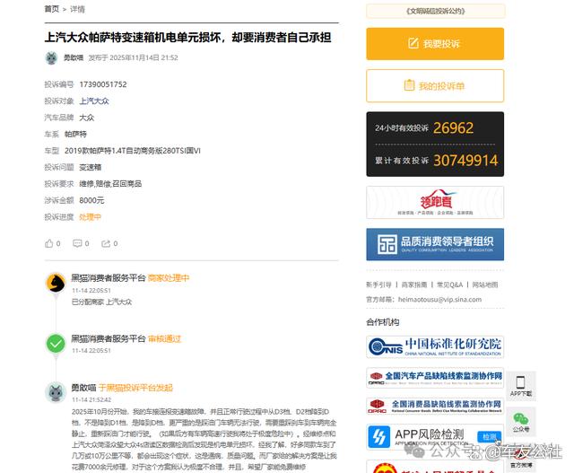 車友公社發現,在黑貓投訴等第三方平臺上,關于上汽大眾的投訴量仍在持續攀升,涉及車型也從途觀 L、途岳、途昂等車型,進一步蔓延至帕薩特。