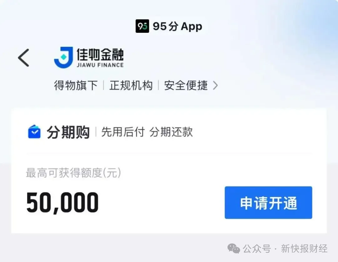 產品信息顯示,95分APP推出分期購服務,該服務為消費分期,支持用戶購物時先用后付、分期還款,最高額度五萬元。相關服務協議顯示,分期放款資金來自四川佳物小額貸款有限公司(簡稱“佳物小貸”)、消金公司等機構。