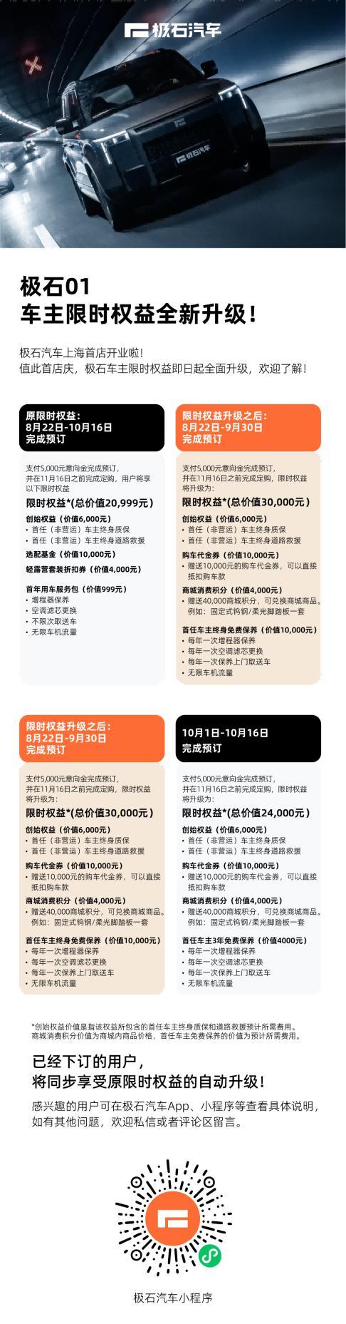 為慶賀首店落成,凡在 9 月 30 日(含)前支付意向金 5,000 元,并在 11 月 16 日之前完成定購極石 01 的用戶,可享有最新升級的 " 首任車主 " 限時購車權益。2023 年 11 月份,極石 01 將開啟全國交付。