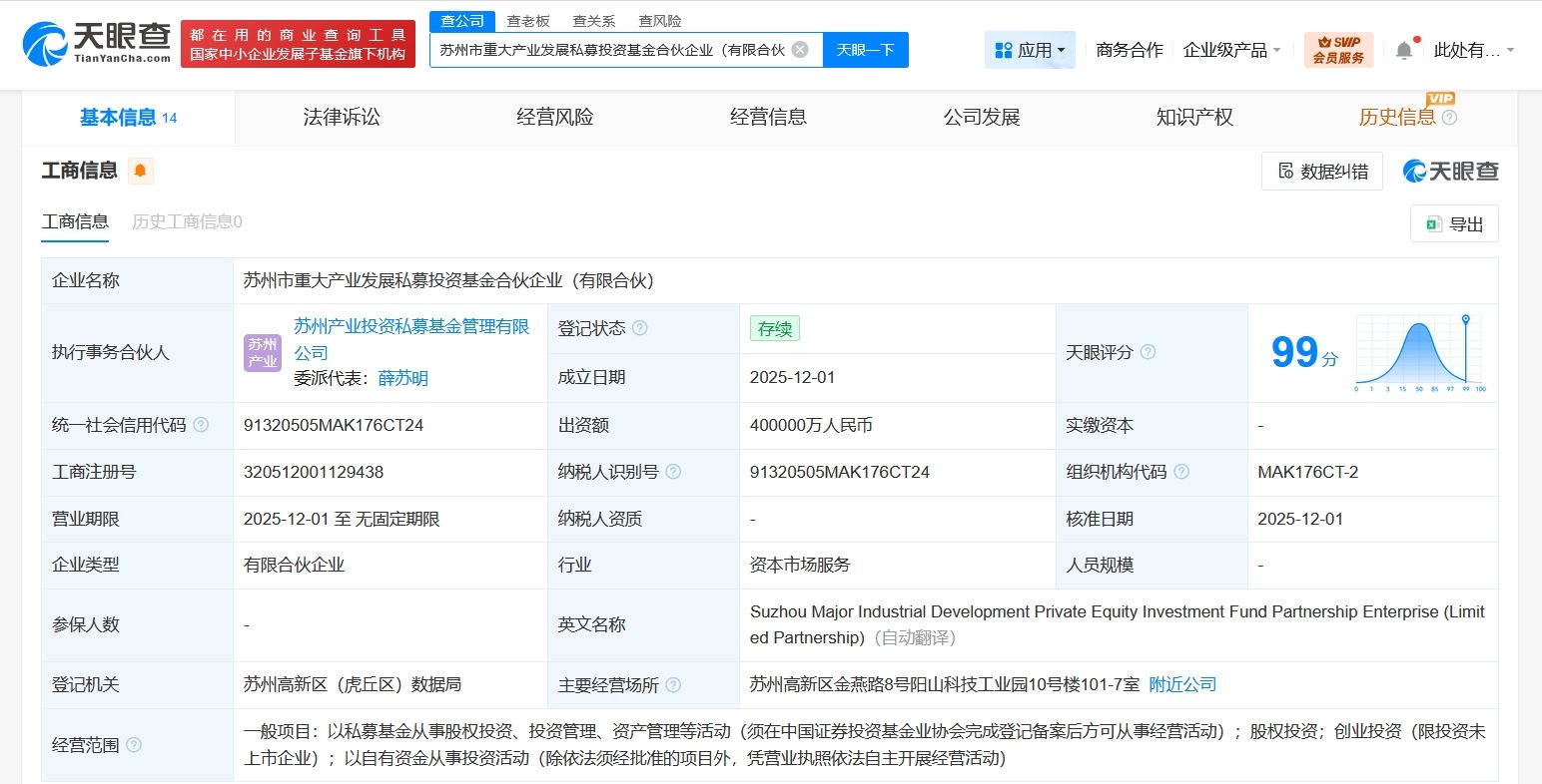 天眼查App顯示,近日,蘇州市重大產業發展私募投資基金合伙企業(有限合伙)成立,執行事務合伙人為蘇州產業投資私募基金管理有限公司,出資額40億人民幣,經營范圍含以私募基金從事股權投資、投資管理、資產管理等活動,股權投資,創業投資,以自有資金從事投資活動。