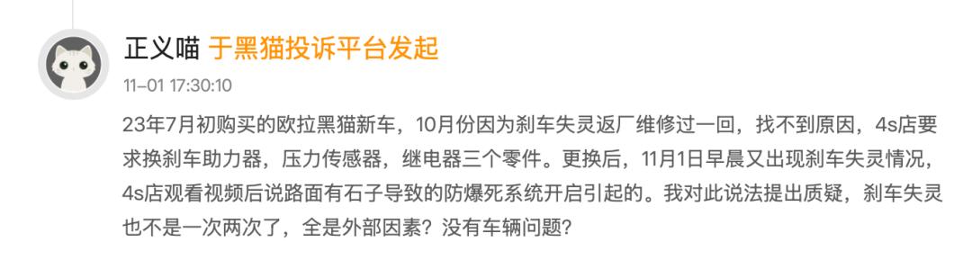 2023年11月1日,又有網(wǎng)友反映稱,其在2023年7月初購(gòu)買(mǎi)的歐拉黑貓新車(chē),10月份因?yàn)閯x車(chē)失靈返廠維修過(guò)一回,找不到原因,4S店要求換剎車(chē)助力器、壓力傳感器、繼電器三個(gè)零件。
