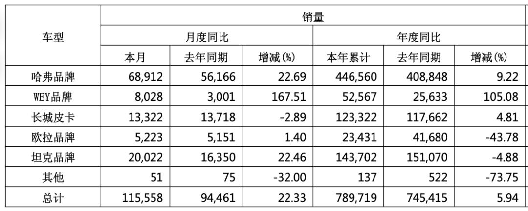 雷達(dá)財(cái)經(jīng)了解到,目前長(zhǎng)城汽車(chē)旗下有哈弗、魏牌、坦克、長(zhǎng)城皮卡、歐拉、長(zhǎng)城靈魂、長(zhǎng)城商用車(chē)等品牌,產(chǎn)品主要涵蓋SUV、轎車(chē)、皮卡、MPV、摩托車(chē)、重卡等品類。