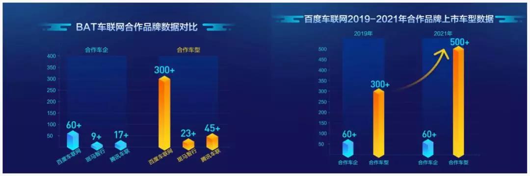 百度車聯(lián)網目前合作車企達到了60余家,車型達到有300多款,在BAT之間已經實現(xiàn)領跑。
