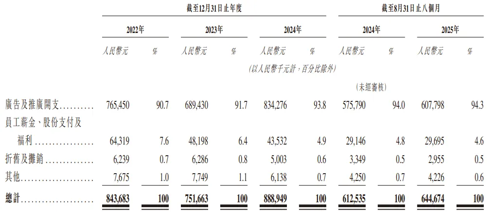 根據最新招股書,2022年到2024年,公司的銷售及營銷開支分別為8.44億元、7.52億元、8.89億元,三年合計24.85億元,分別占收入的50.6%、40.7%、40.2%。今年前八個月,該部分的比例有所下滑,為38.3%。