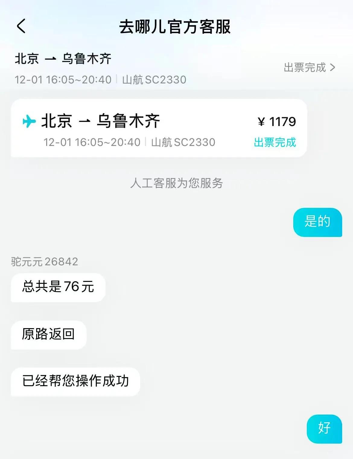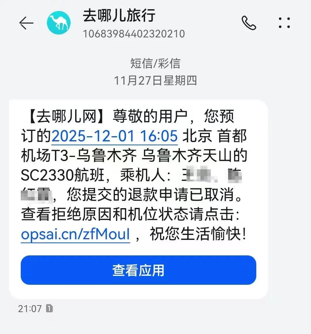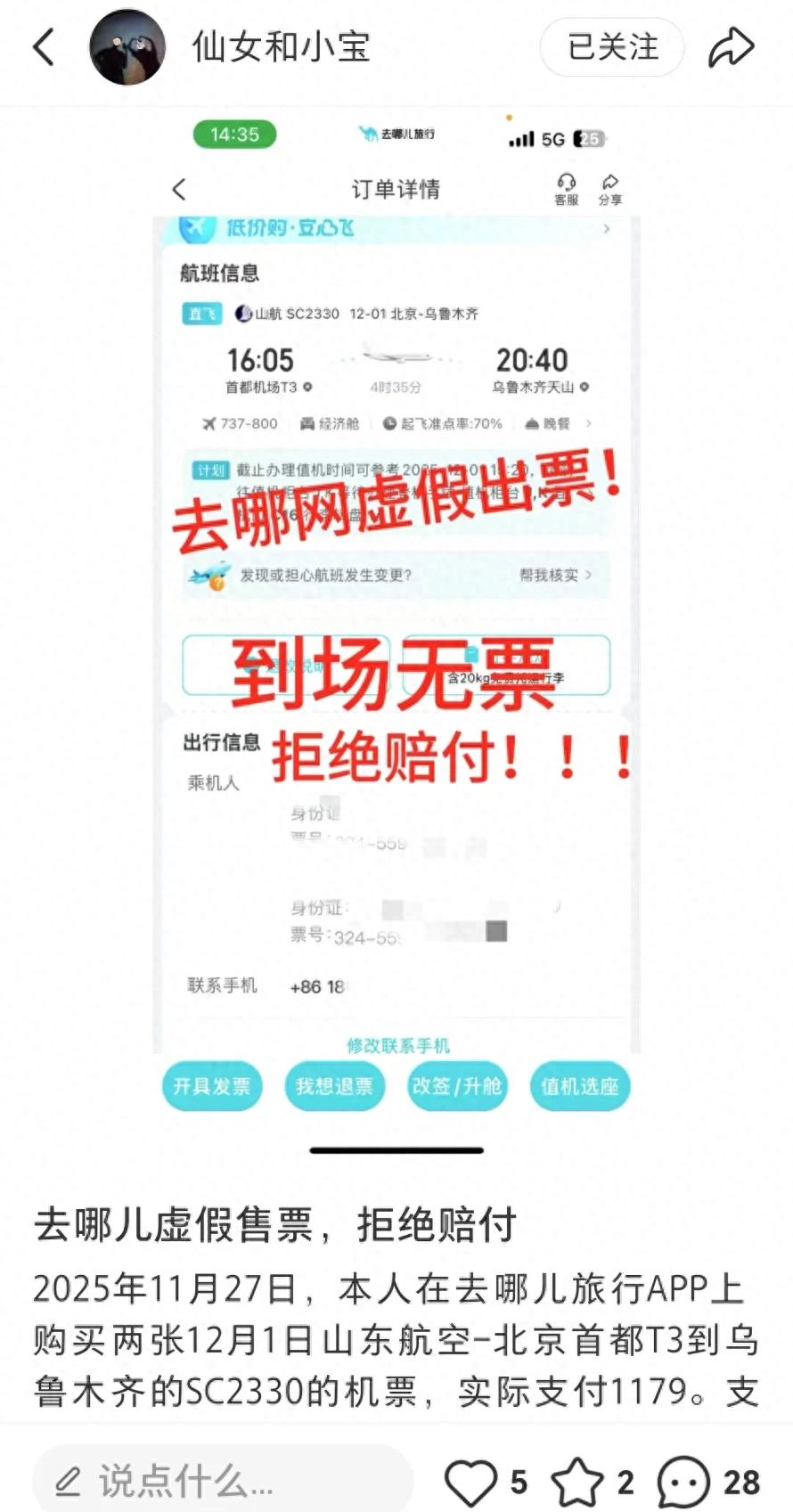 網友“仙女和小寶”在網帖中講述:“2025年11月27日,本人在去哪兒旅行App上購買兩張12月1日山東航空-北京首都T3到烏魯木齊的SC2330的機票,實際支付1179。支付完成后不久,App顯示出票完成,并收到出票短信?!?/p>