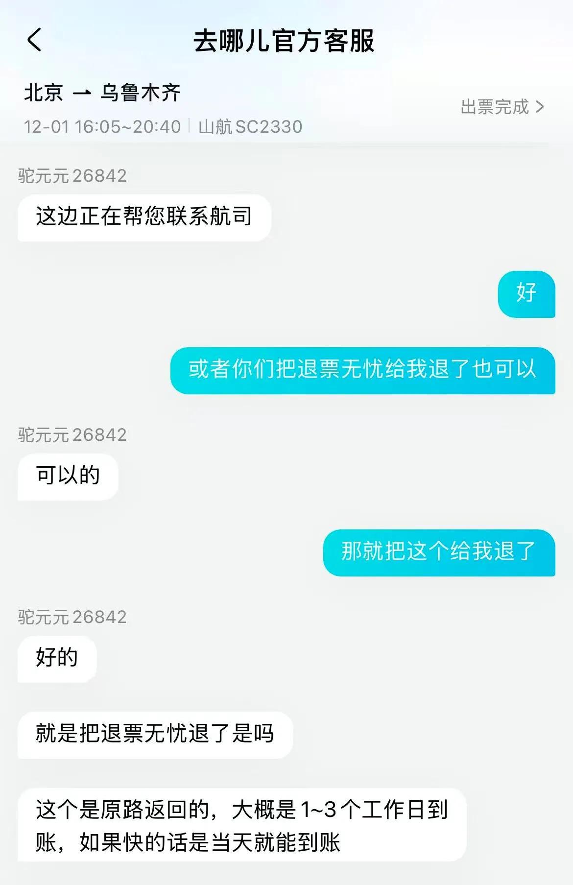 于是,王女士第一時間聯系了“去哪兒”的客服,經過溝通,由客服幫她退掉了2份“退票無憂”套餐,王女士也很快收到了76元退款。不論是與客服的溝通,還是最終退還的金額,都沒有涉及到退機票款,王女士也沒有收到機票退款,也沒有被告知機票已經被退。