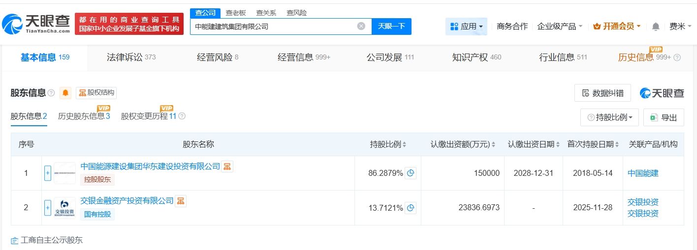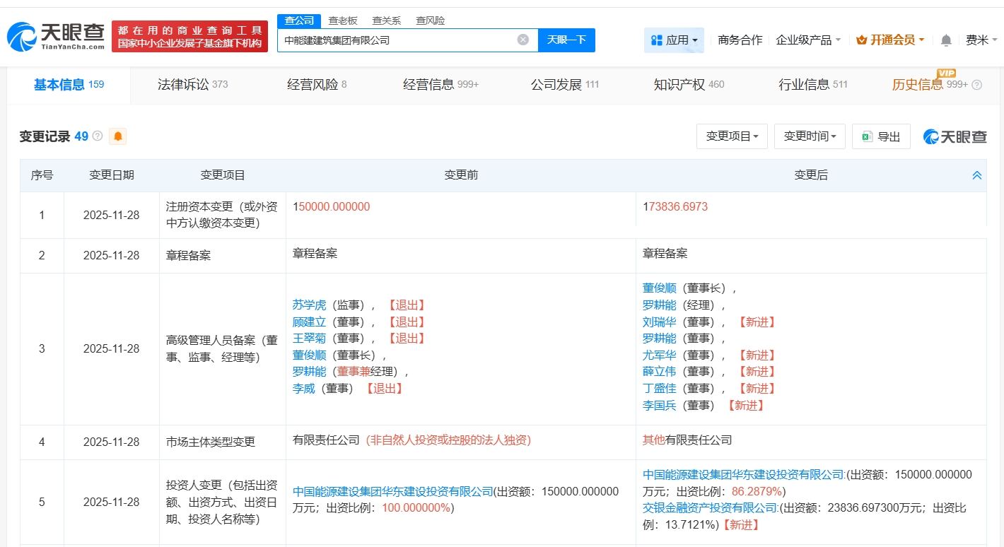 天眼查工商信息顯示,近日,中能建建筑集團有限公司發(fā)生工商變更,新增交銀金融資產(chǎn)投資有限公司為股東,注冊資本由15億人民幣增至約17.4億人民幣,增幅約16%,同時,多位主要人員發(fā)生變更。