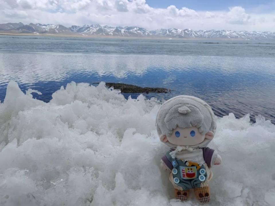 ▲西藏姑娘白瑪曲珍帶著從拼多多購買的玩偶打卡納木措