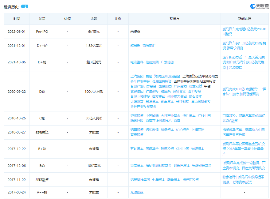 并且,威馬也是不缺資金的那個。據天眼查APP顯示,威馬從成立至今一共完成了12輪融資,最近一輪是2022年6月1日總額約為6億美元的Pre—IPO輪融資,共累計融資金額高達約350億元。