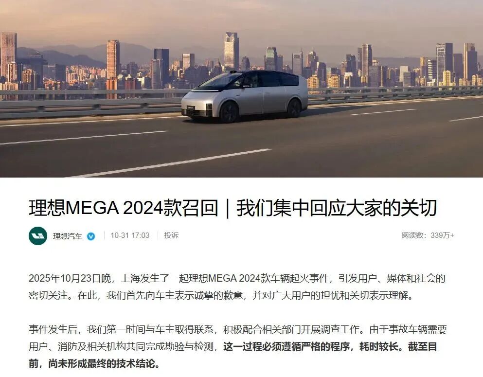 10月31日,理想汽車主動向國家市場監督管理總局備案召回和事故車同批次所有的理想MEGA 2024款車輛,進行安全檢測與更換維修。