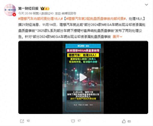 起因是理想汽車啟動了對“2024款MEGA車輛出現冷卻液滲漏批量質量事故”及“2025款L系列部分車輛下擺臂襯套異響批量質量事故”內部問責。