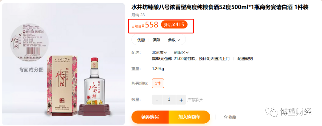 公司官網顯示,一瓶水井坊·井臺(52度500ml)的建議零售價為808元;而在天貓超市,相同規格的產品活動券后價僅為605元。