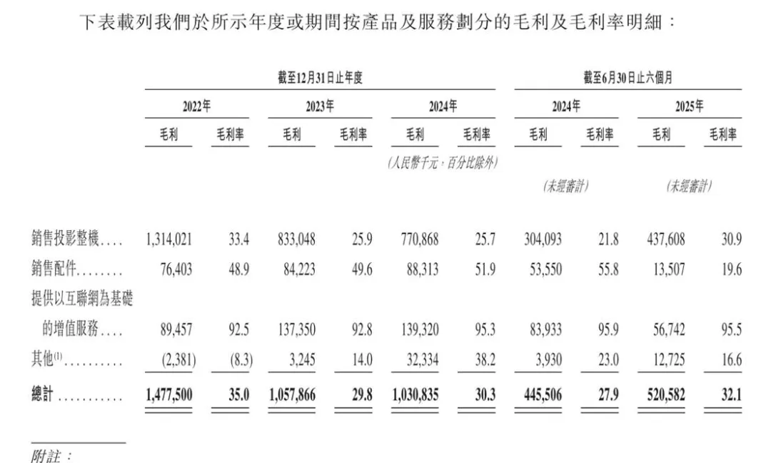 分業務來看,極米科技的核心收入來源投影儀2022年-2024年的毛利率逐年下滑,各期分別為33.4%、25.9%、25.7%。而2025年上半年,極米科技的投影儀毛利率達到了30.9%,同比提升了9.1個百分點。