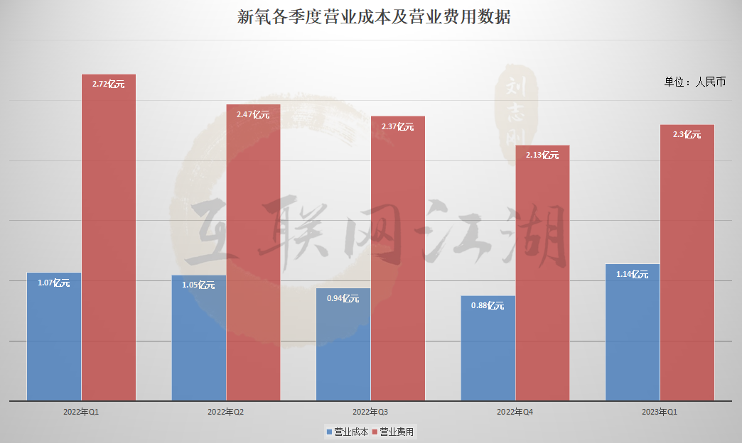 財報數據顯示,新氧在2022年四個季度以及今年Q1的單季度營業成本分別為1.07億、1.05億、0.94億、0.88億、1.14億,營業費用分別為2.72億、2.47億、2.37億、2.13億、2.3億。