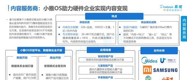 目前,小雅OS覆蓋智能音箱產品、兒童智能產品、手表智能產品、車載智能產品,合作伙伴有美的、小米、三星、華為、中國移動等眾多一線企業。